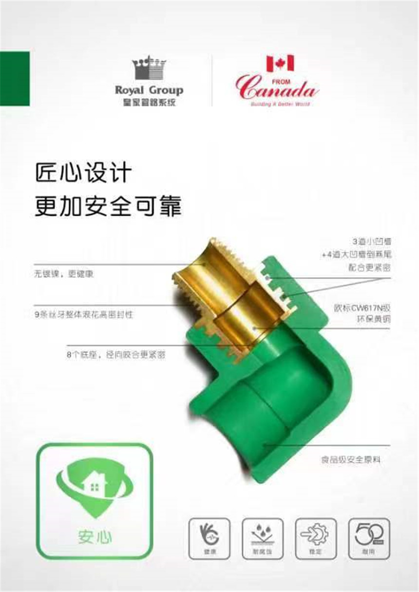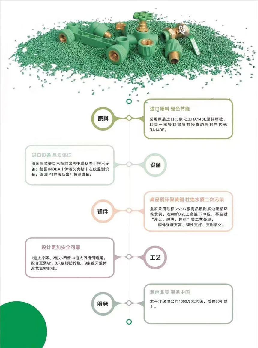 PP-R冷熱水管路系統(tǒng)皇家PP-R管材、管件件均采用進(jìn)口北歐化工(博祿)PP-R樹(shù)脂顆粒,采用技術(shù)先進(jìn)的巴頓菲爾擠出機(jī)設(shè)備生產(chǎn)。PP-R管材按照GB/T18742.2-2002,管件按照GB/T18742.3-2002組織生產(chǎn)。PP-R管以質(zhì)輕耐用、綠色環(huán)保、使用壽命長(zhǎng)等眾多優(yōu)點(diǎn)廣泛運(yùn)用于室內(nèi)冷熱給水系統(tǒng)、純凈水系統(tǒng)和地板采暖系統(tǒng),越來(lái)越受到人們的青睞。